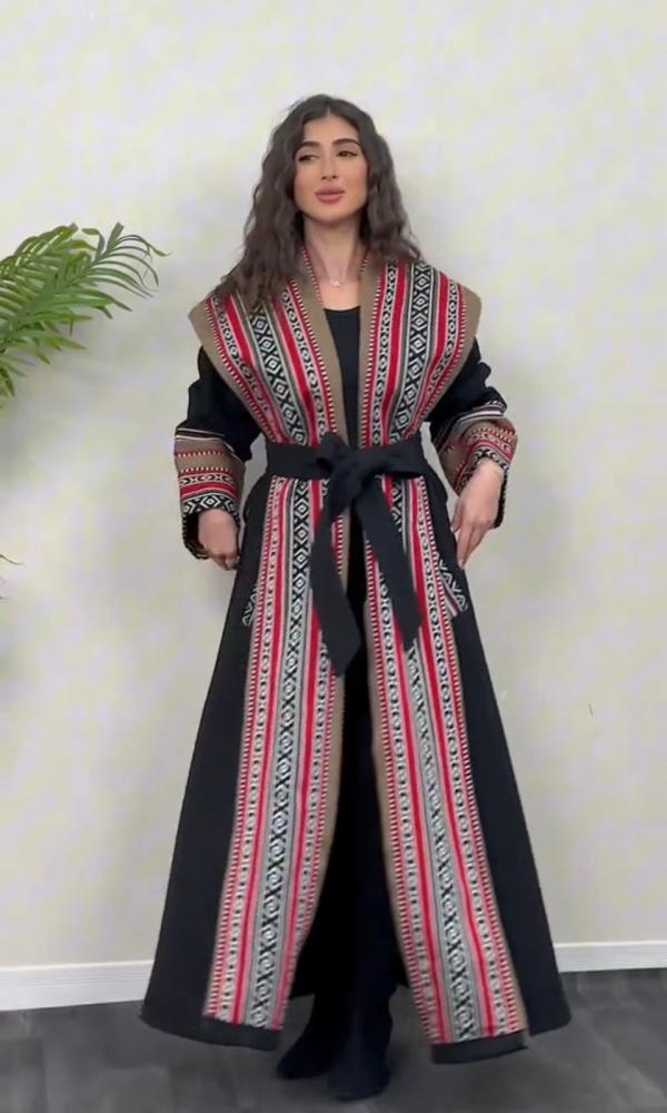 عباية تراثية فاخرة تجمع بين الأصالة والأناقة، بتصميم مستوحى من نقوش السدو السعودي الأصيلة على قماش جملي فاخر. تأتي بقصة أنيقة مع حزام على الخصر وتفاصيل منسوجة بعناية بالألوان الحمراء والسوداء لتضفي لمسة فخر وانتماء على إطلالتك.