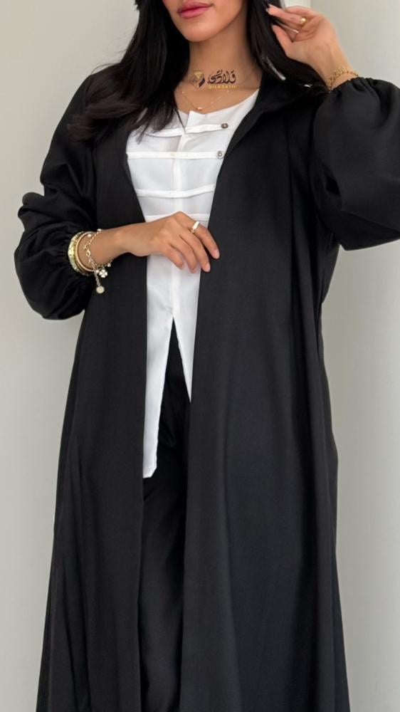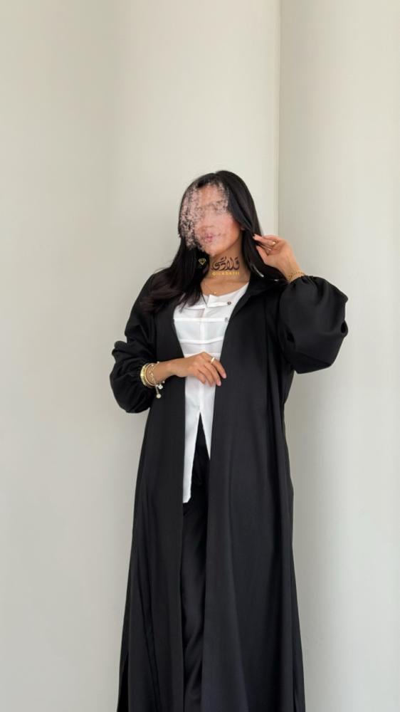 العباية السوداء تتسم بسلاسة القماش وانسيابيته، مع لمسة تصميم كلاسيكية ومريحة في اللبس