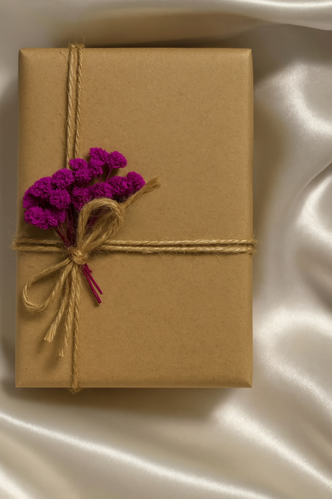 اجعل هديتك مميزة مع تغليف قلادتي الراقي. علبة كرتونية بلون طبيعي أنيق، مربوطة بخيط خيش ريفي فاخر ومزينة بزهور مجففة بنفسجية تمنحها لمسة رومانسية دافئة. مثالية لتقديم الإكسسوارات، المجوهرات، والقطع الخاصة في جميع مناسباتك المميزة