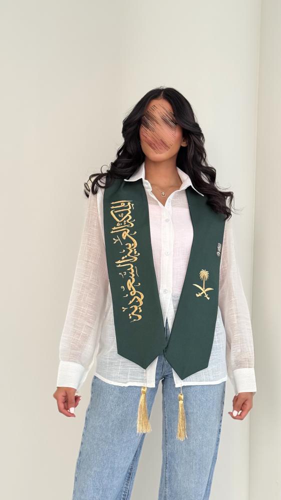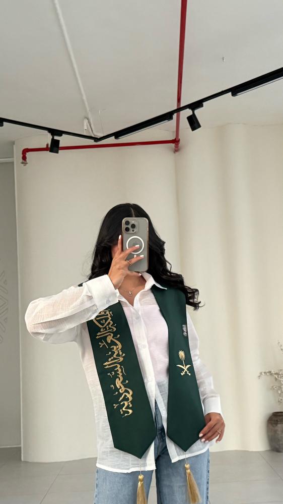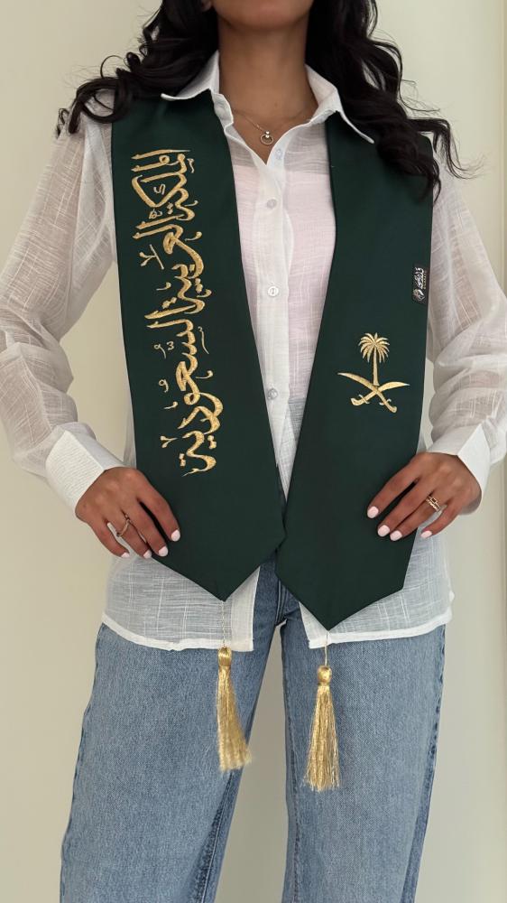 أضف لمسة من الفخر والاعتزاز لوطنك مع وشاح اليوم الوطني السعودي بلونه الأخضر الملكي وتطريزاته الذهبية الفاخرة. يتميز بتصميم أنيق يحمل عبارة “المملكة العربية السعودية” مع الشعار الوطني (السيفين والنخلة) مطرز بدقة عالية، مزين بلمسات خيوط ذهبية متدلية تمنحه طابعًا راقيًا.