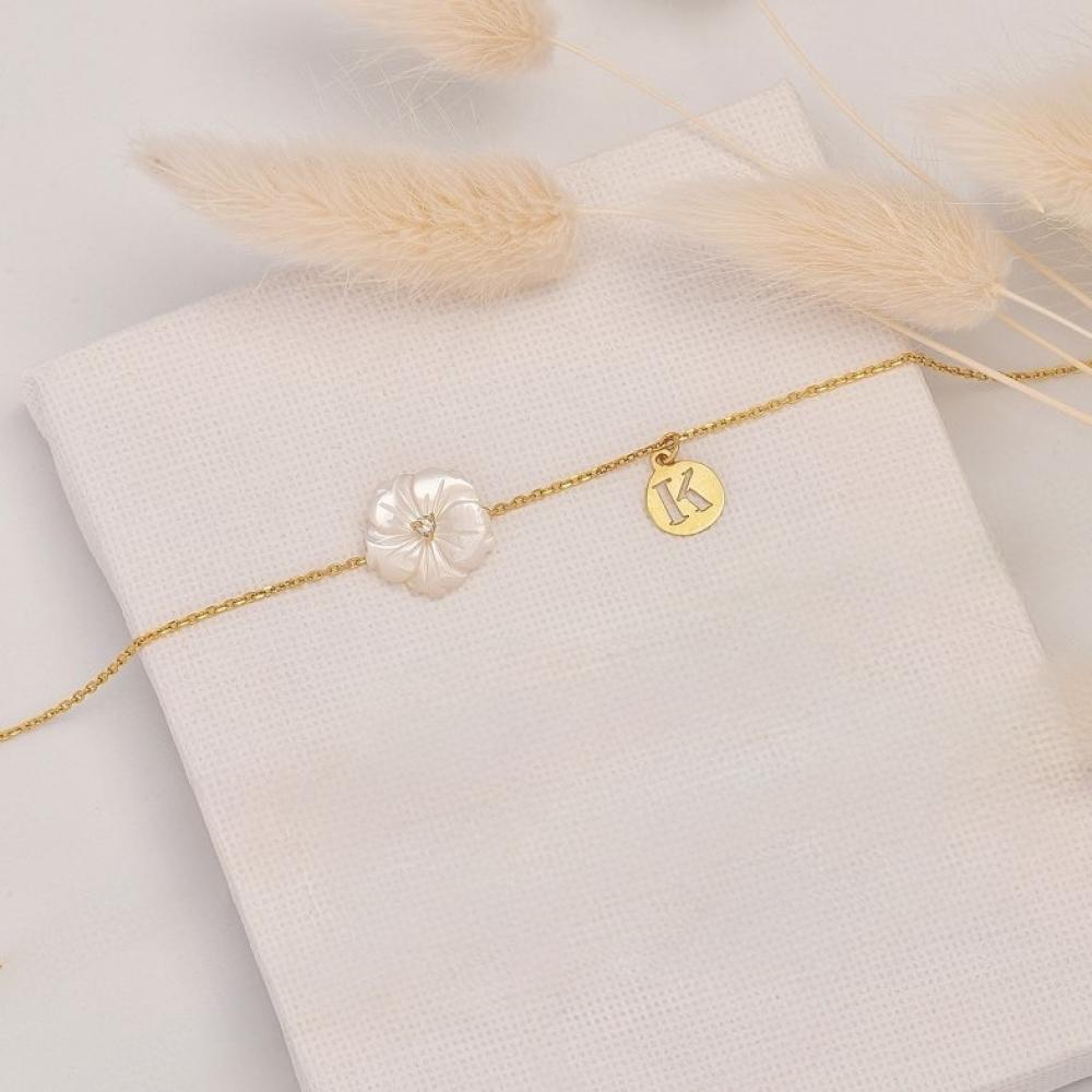 أسوارة حرف داخل دائرة مع وردة صدف زركون – مطلية ذهب