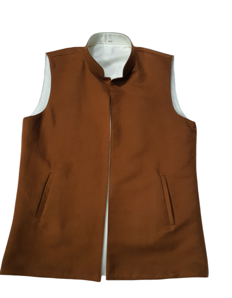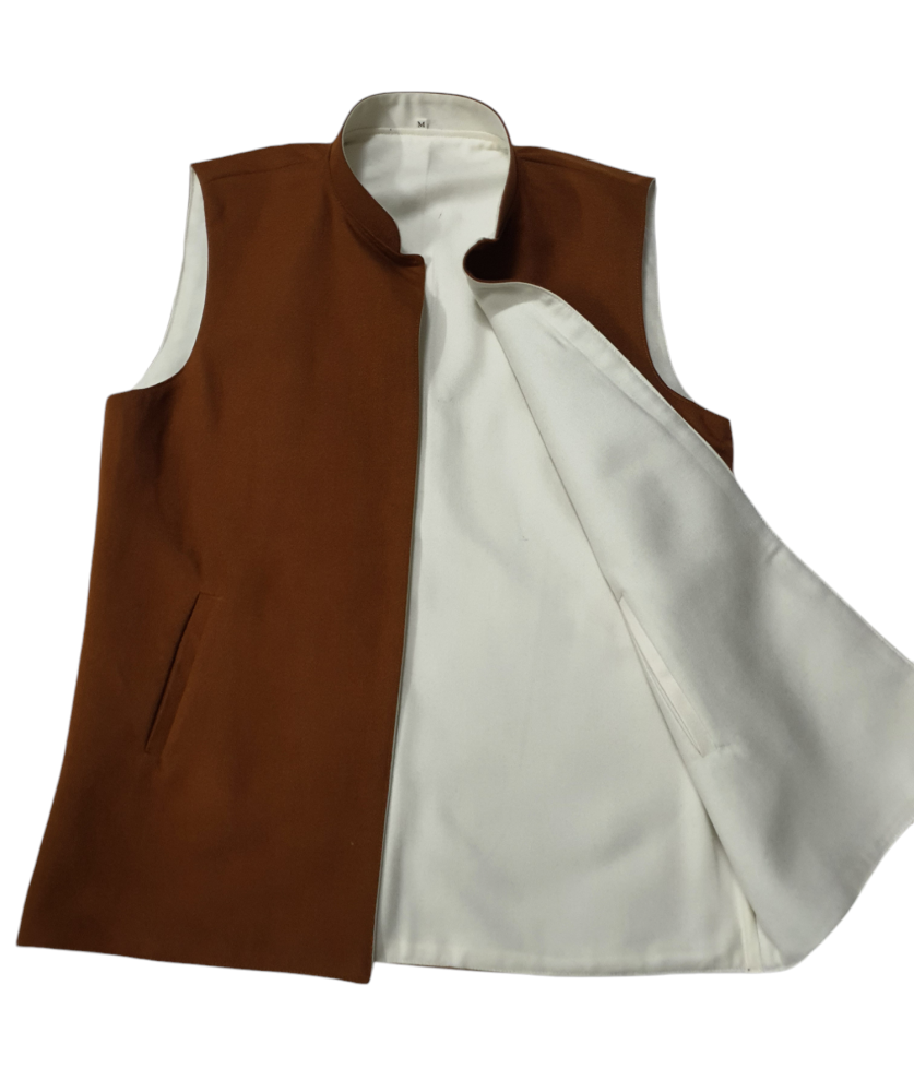 صديري رجالي فاخر باللون الجملي، مبطن من الداخل باللون الأبيض لإطلالة متوازنة تجمع بين الفخامة والراحة. تصميم عصري بدون أكمام مع ياقة أنيقة وجيوب جانبية عملية، مناسب للارتداء فوق الثوب أو القميص. خامة عالية الجودة تعطي مظهراً أنيقاً ودافئاً في المناسبات الرسمية واليومية.