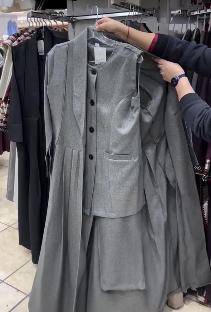 يتكوّن من ثلاث قطع متناسقة (عباية بليزر + فست داخلي + بنطلون) تُفصَّل حسب الطلب لضمان المقاس المثالي.