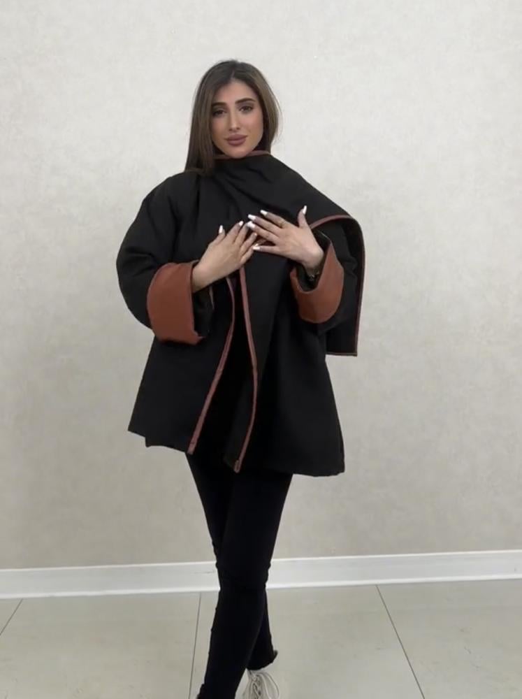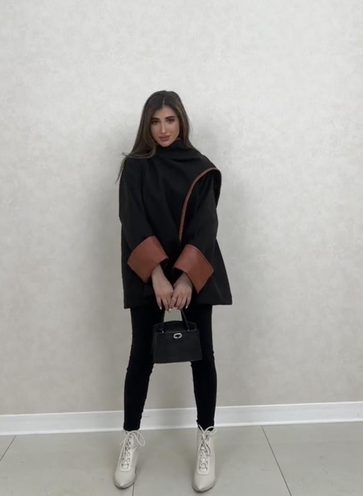 جاكيت شتوي أنيق باللون الأسود مع لمسات جلدية باللون البني على الكمام والحواف لإطلالة تجمع بين البساطة والفخامة.
