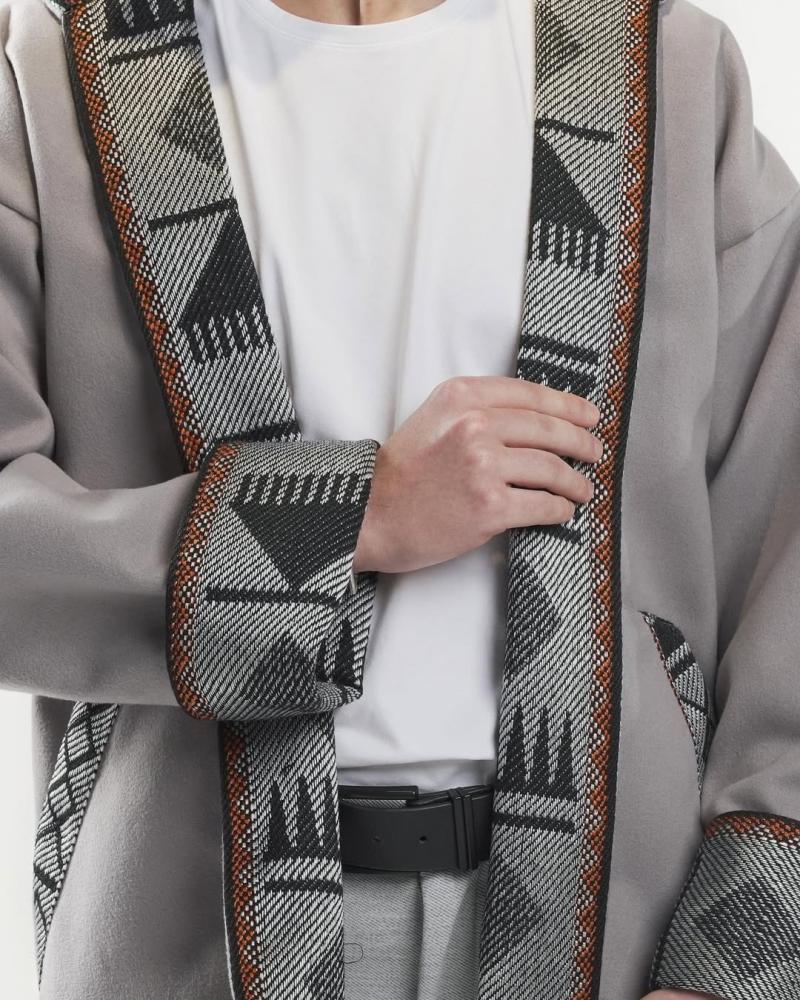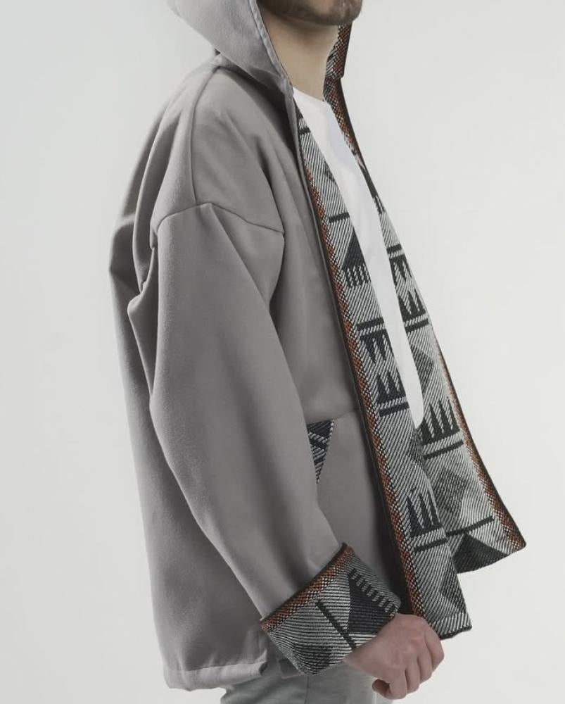 جاكيت عصري أنيق بلون رمادي فاتح يضفي مظهراً راقياً يناسب مختلف الإطلالات. يتميز بتفاصيل فريدة على الحواف والأكمام بنقش السدو التراثي تضيف طابعاً تراثياً مميزاً.